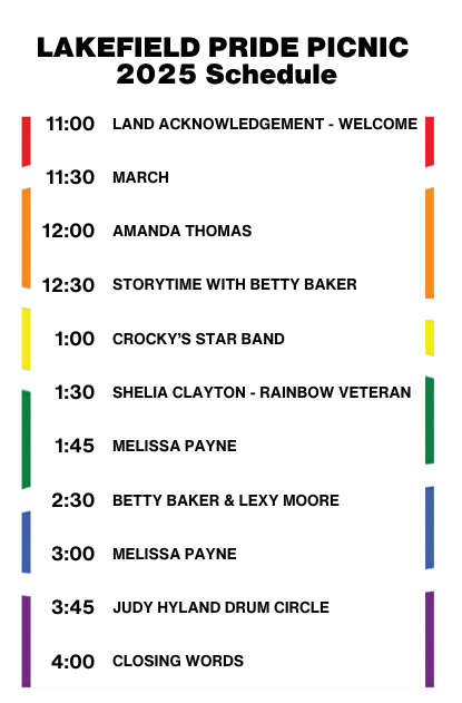 The Lakefield Pride Picnic is an annual family event founded in 2021. We celebrate and empower the LGBT2SQIA+ community.